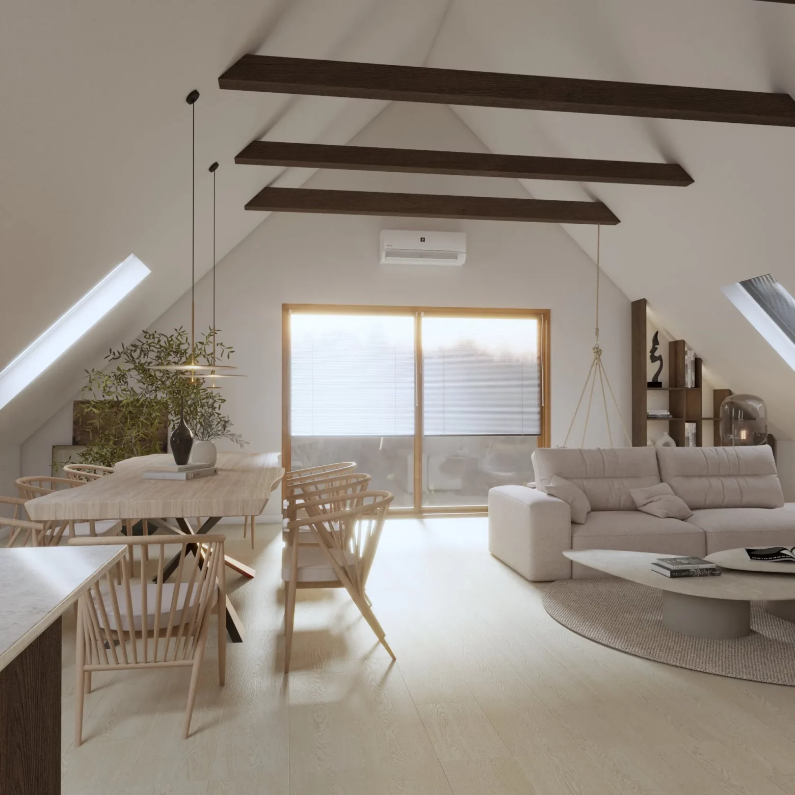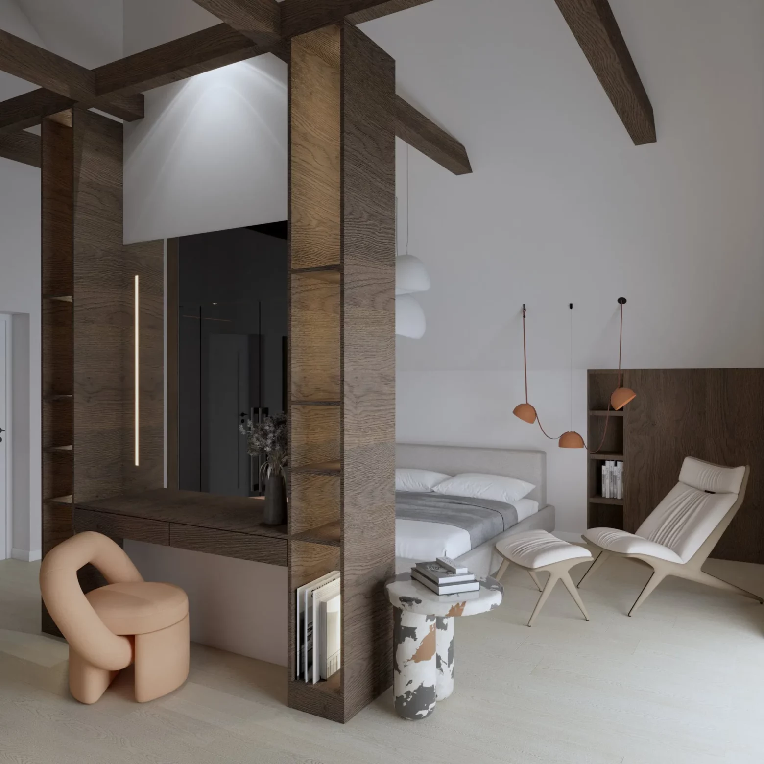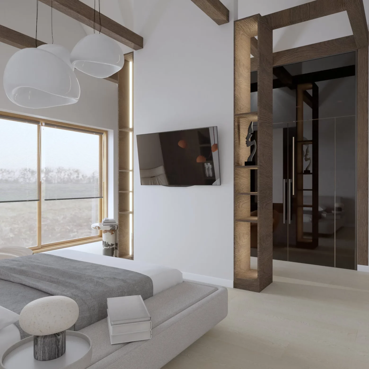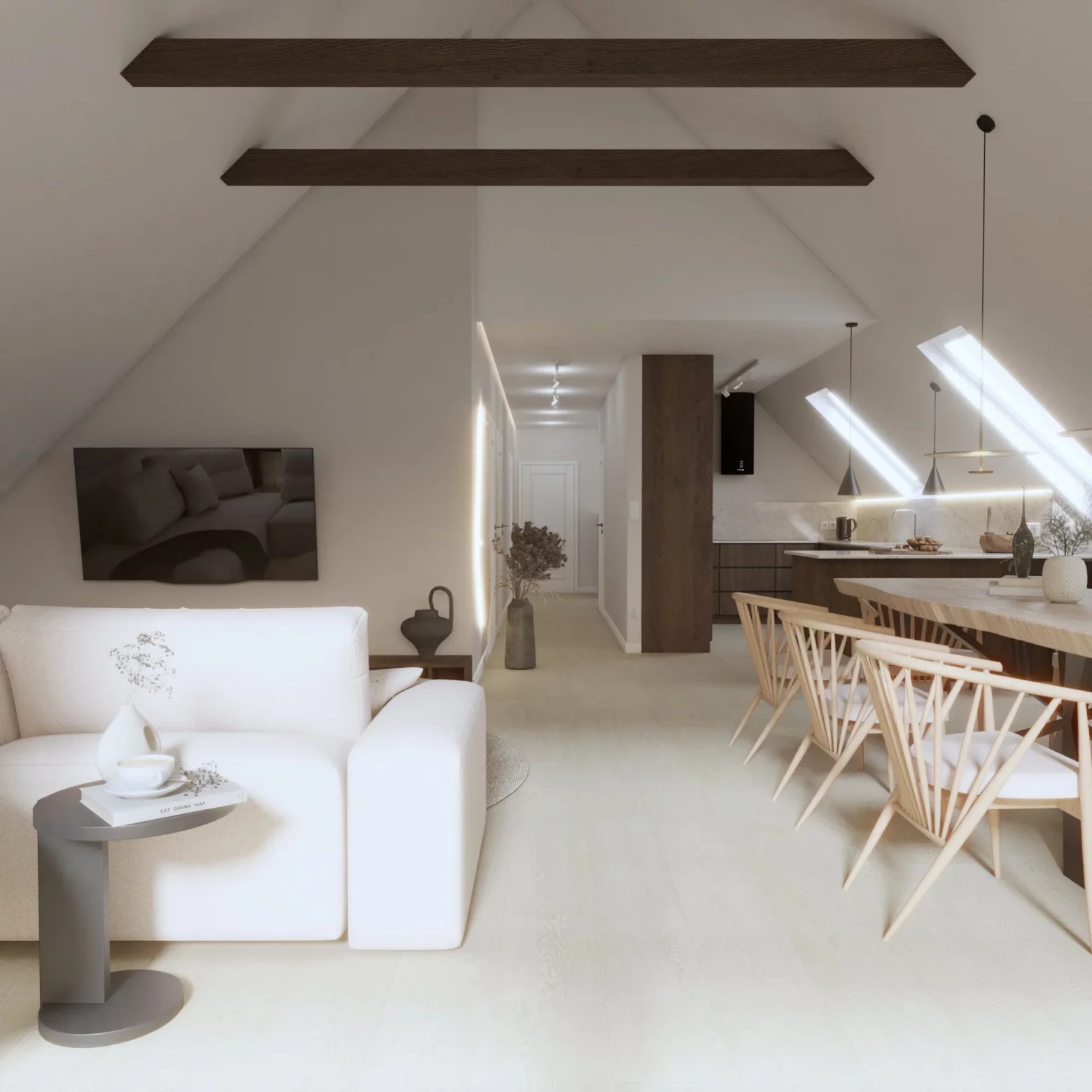 Ten projekt nowoczesnego mieszkania to połączenie jasnych przestrzeni, naturalnych materiałów i skandynawskiej prostoty. Drewniane belki, ciepłe barwy i funkcjonalne meble tworzą przytulne wnętrze, które inspiruje spokojem i harmonią. Idealne dla osób ceniących naturalne piękno i minimalizm w codziennym życiu.