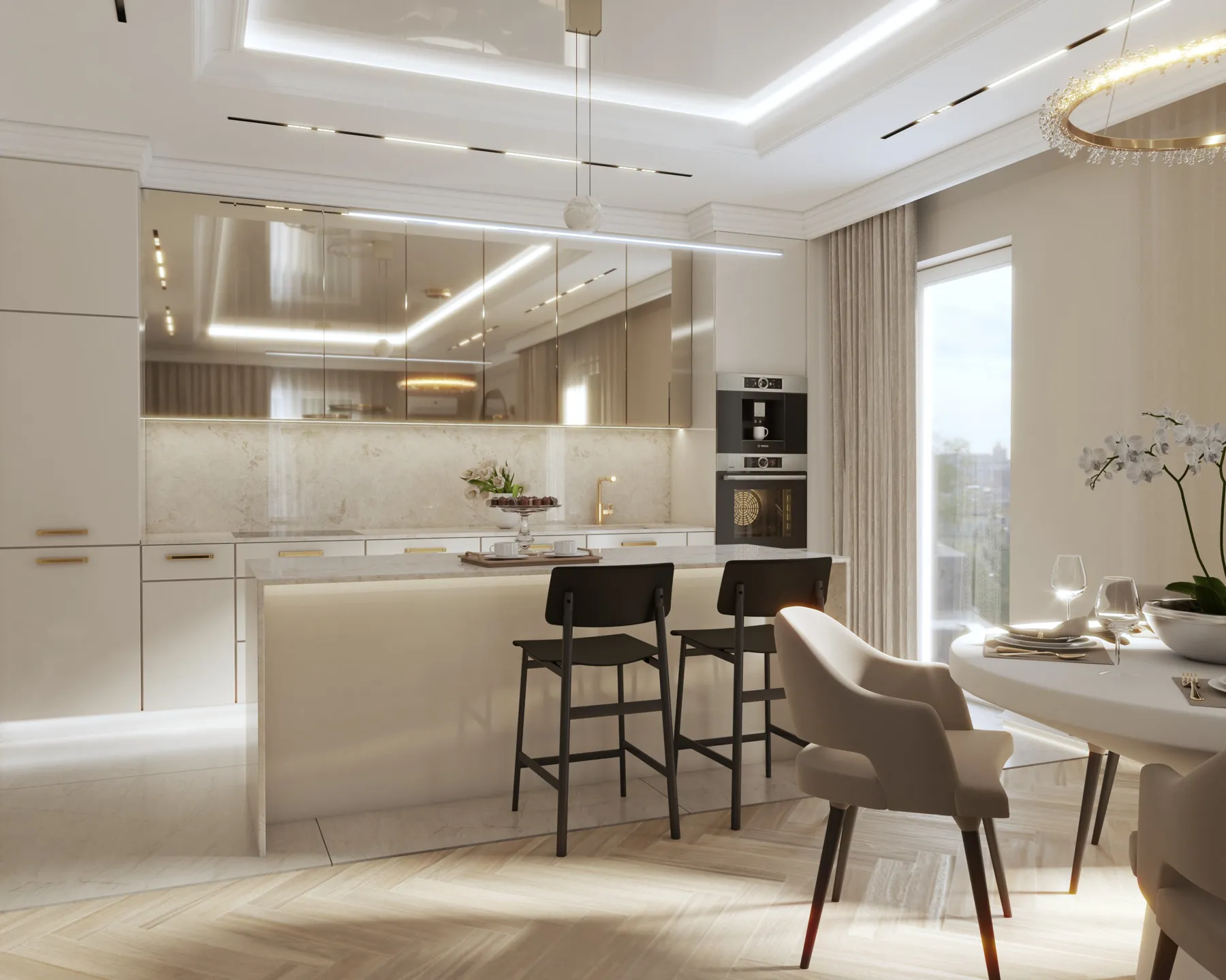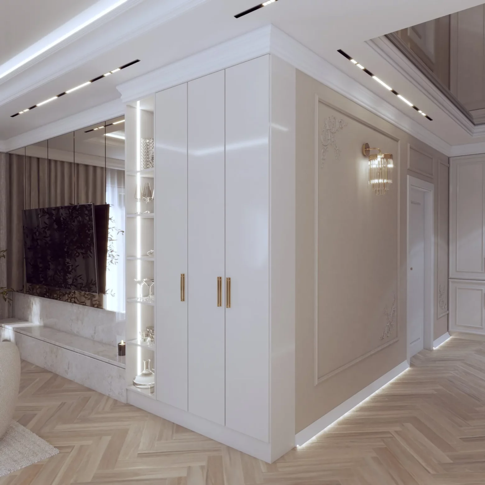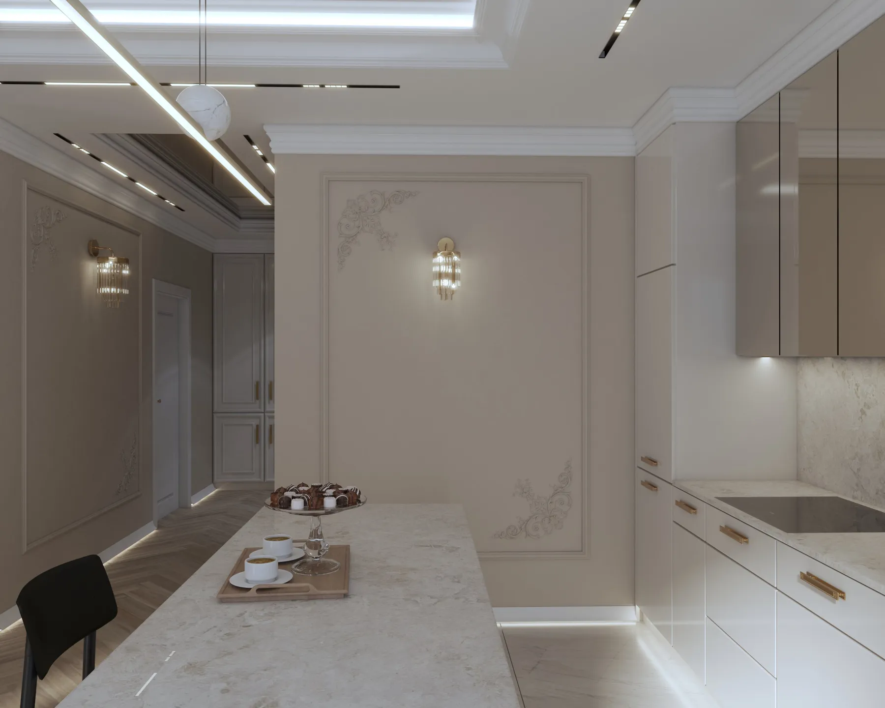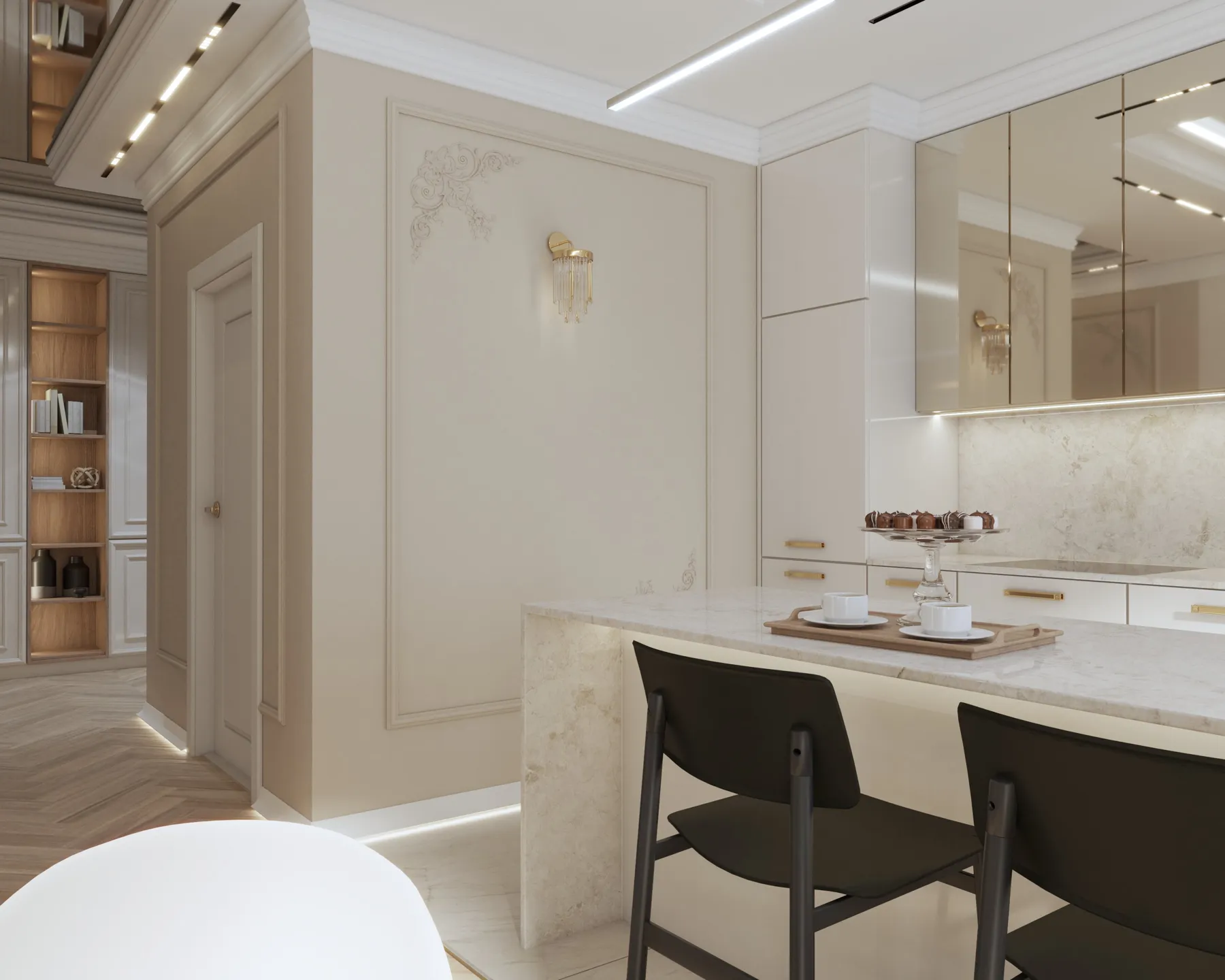 Projekt wnętrz w tym apartamencie skupia się na harmonii przestrzeni, światła i materiału. Każda strefa – od kuchni z wyspą, przez dopracowane łazienki, aż po reprezentacyjny przedpokój – została zaplanowana z myślą o codziennym komforcie i spójnej estetyce. Wnętrze opiera się na jasnej bazie kolorystycznej, uzupełnionej o lustrzane powierzchnie i subtelne detale, które nadają projektowi lekkość i wrażenie większej przestrzeni. Projektowanie wnętrz w tym wydaniu to balans między funkcją a stylem – bez kompromisów.