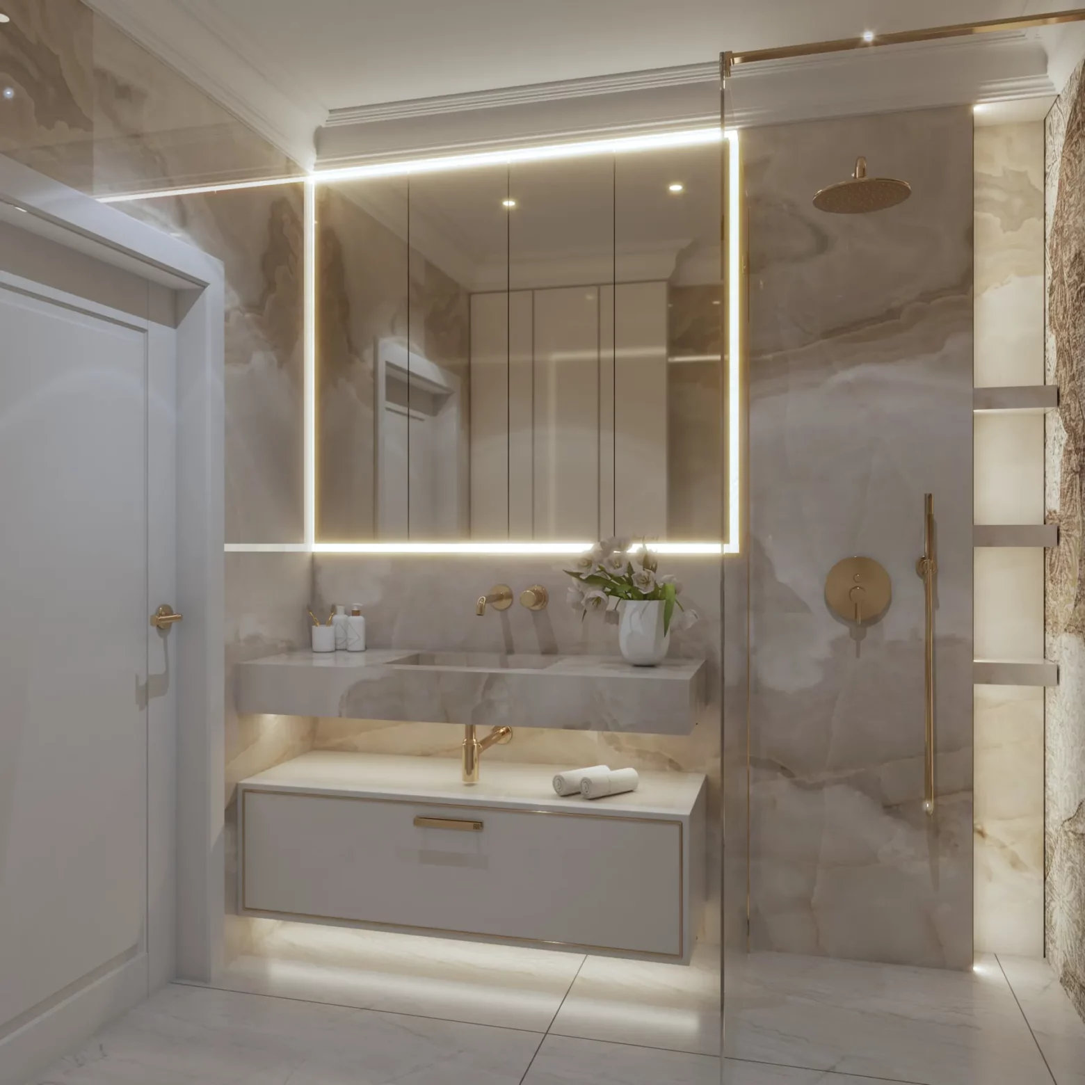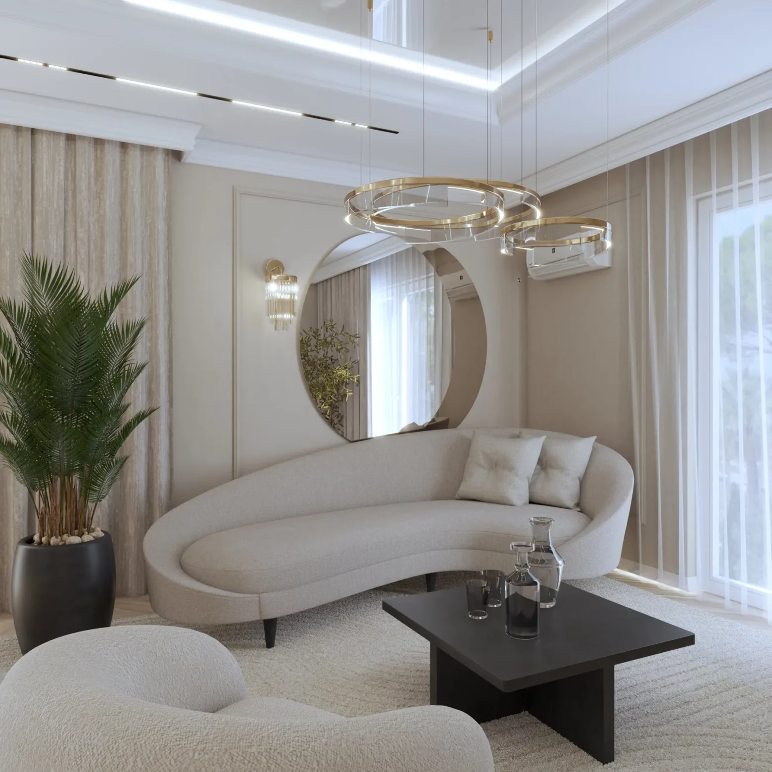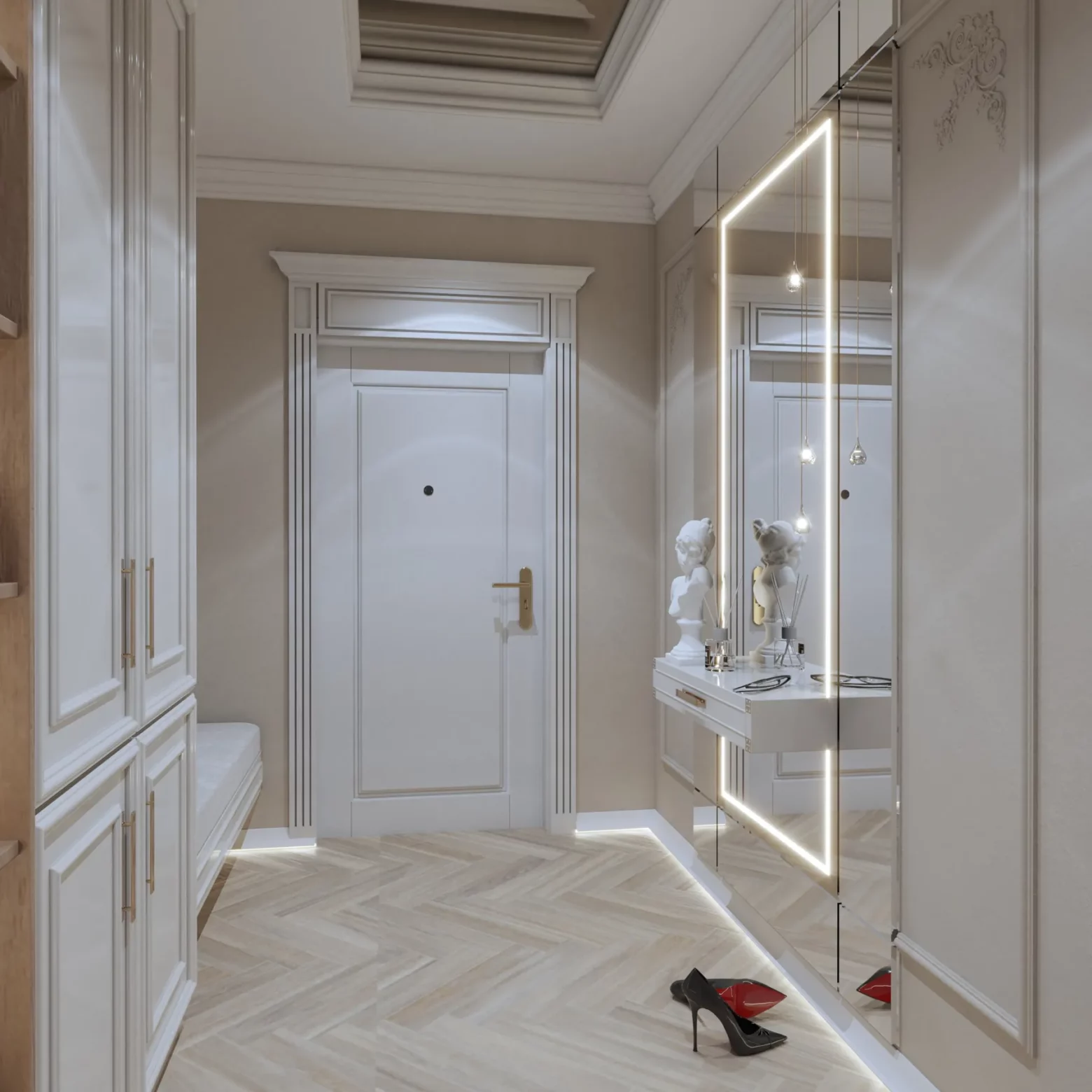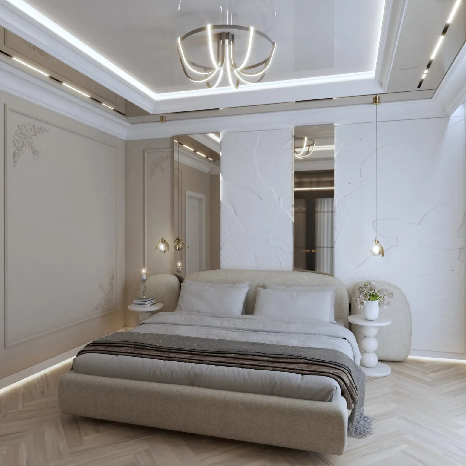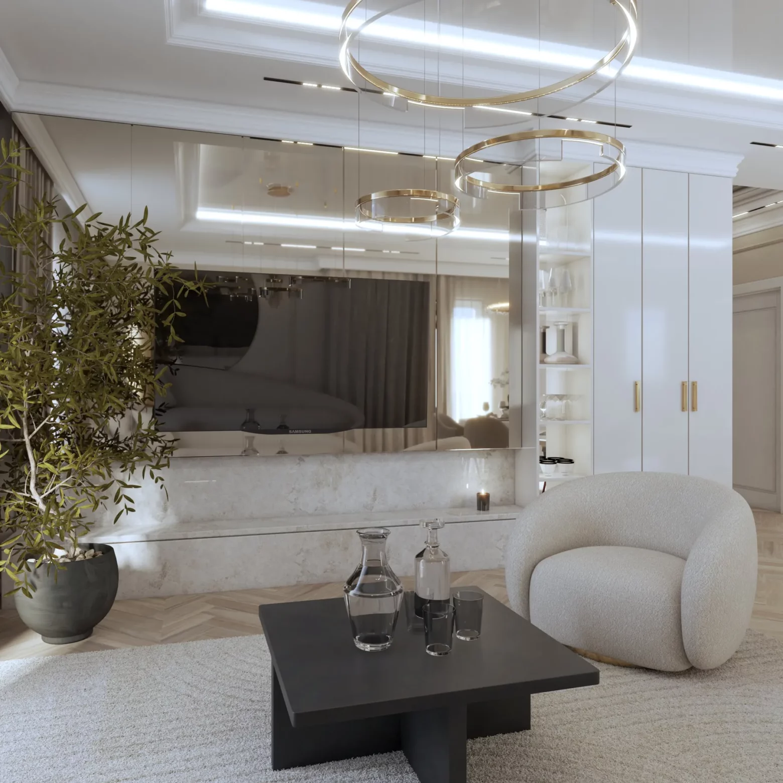 Projekt wnętrz w tym apartamencie skupia się na harmonii przestrzeni, światła i materiału. Każda strefa – od kuchni z wyspą, przez dopracowane łazienki, aż po reprezentacyjny przedpokój – została zaplanowana z myślą o codziennym komforcie i spójnej estetyce. Wnętrze opiera się na jasnej bazie kolorystycznej, uzupełnionej o lustrzane powierzchnie i subtelne detale, które nadają projektowi lekkość i wrażenie większej przestrzeni. Projektowanie wnętrz w tym wydaniu to balans między funkcją a stylem – bez kompromisów.