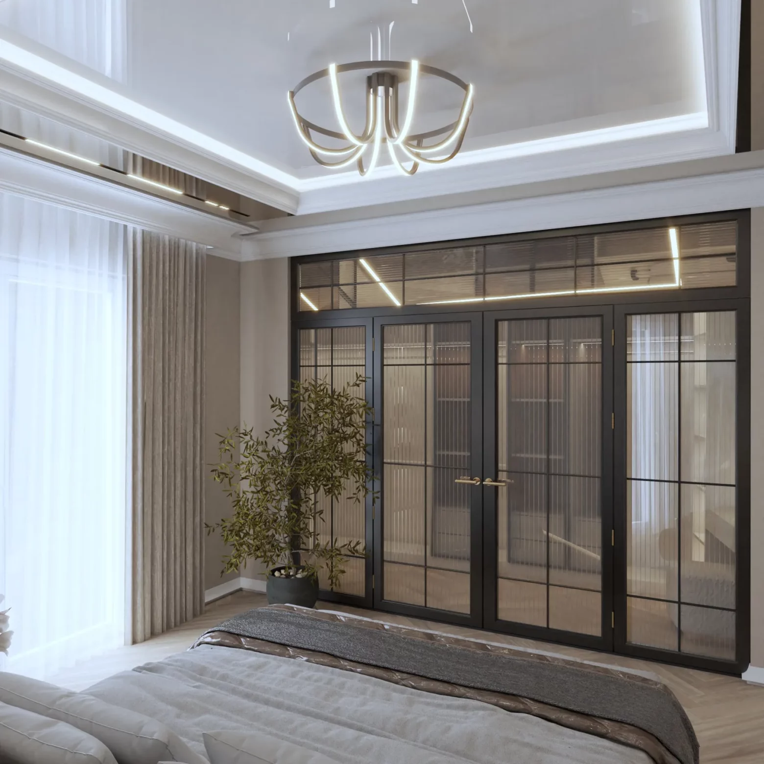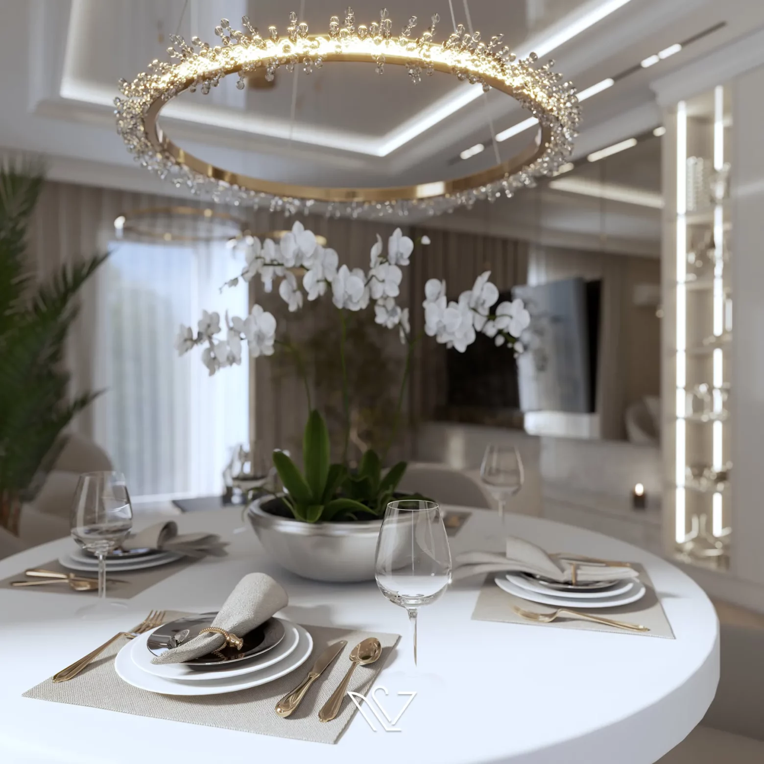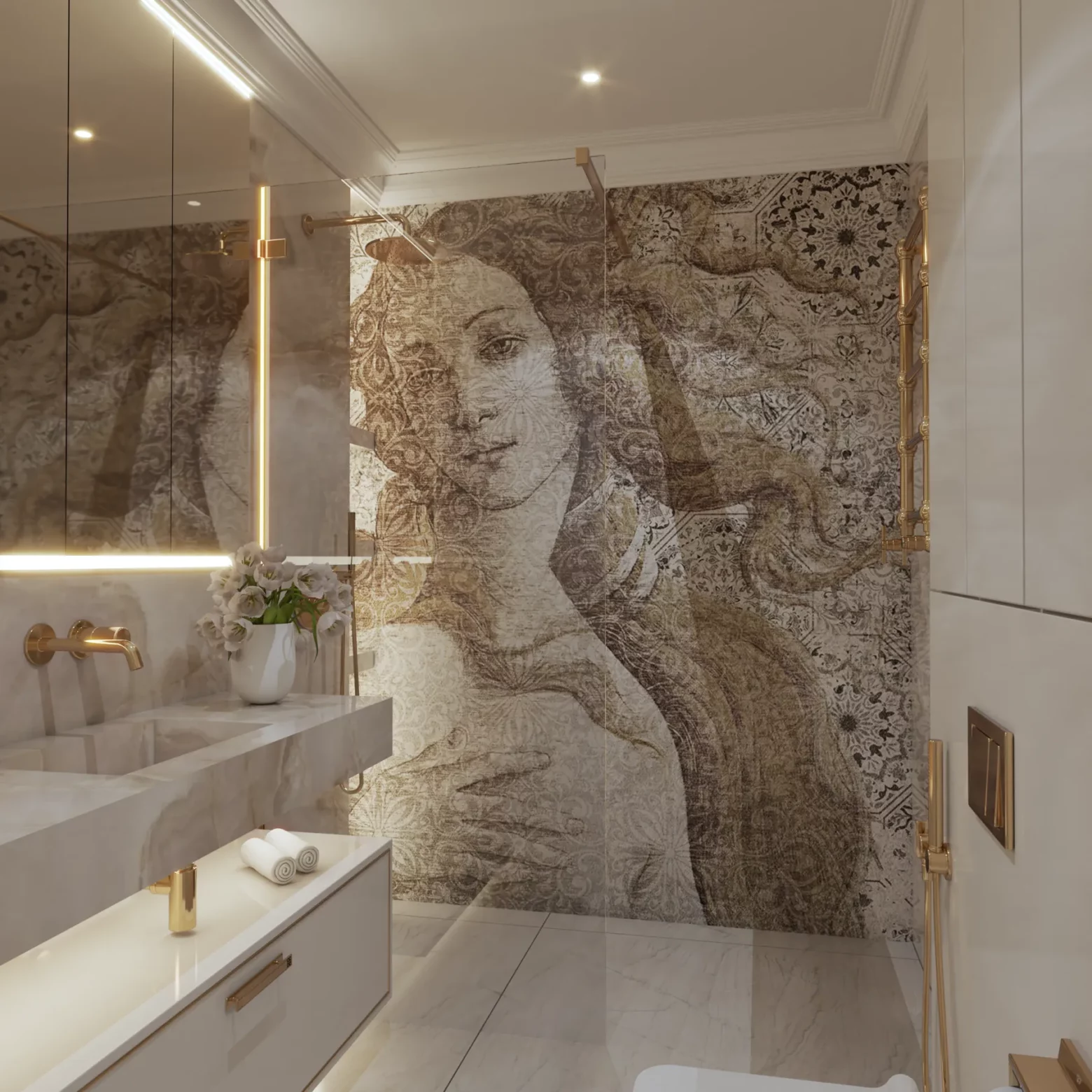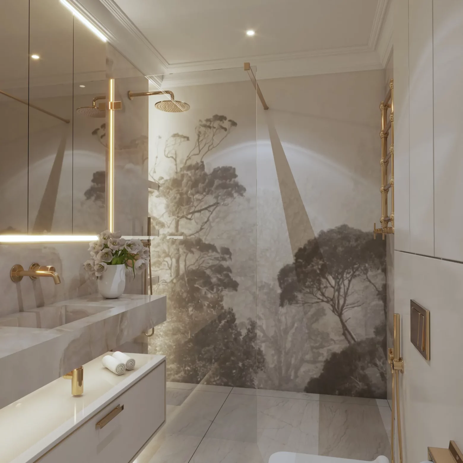 Projekt wnętrz w tym apartamencie skupia się na harmonii przestrzeni, światła i materiału. Każda strefa – od kuchni z wyspą, przez dopracowane łazienki, aż po reprezentacyjny przedpokój – została zaplanowana z myślą o codziennym komforcie i spójnej estetyce. Wnętrze opiera się na jasnej bazie kolorystycznej, uzupełnionej o lustrzane powierzchnie i subtelne detale, które nadają projektowi lekkość i wrażenie większej przestrzeni. Projektowanie wnętrz w tym wydaniu to balans między funkcją a stylem – bez kompromisów.