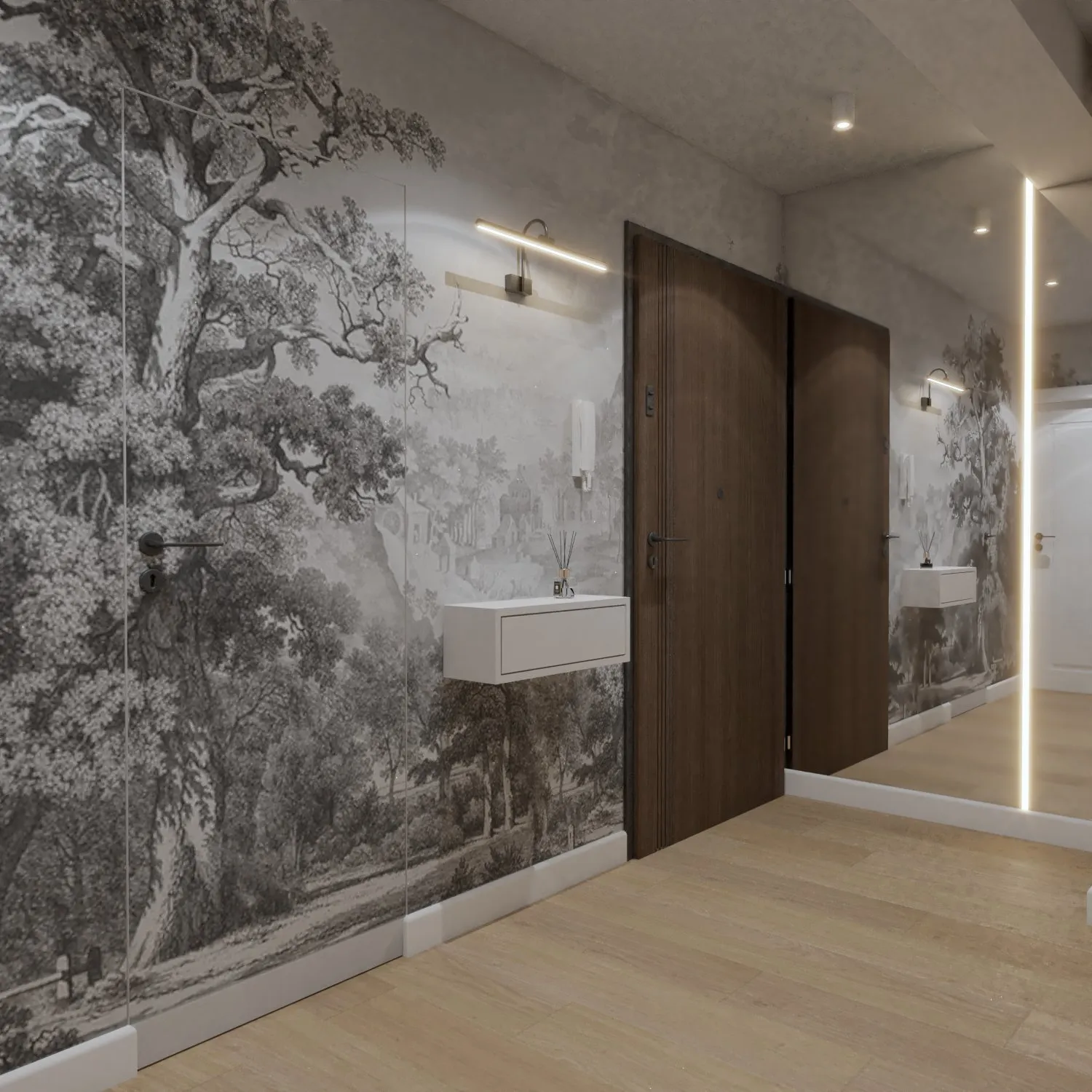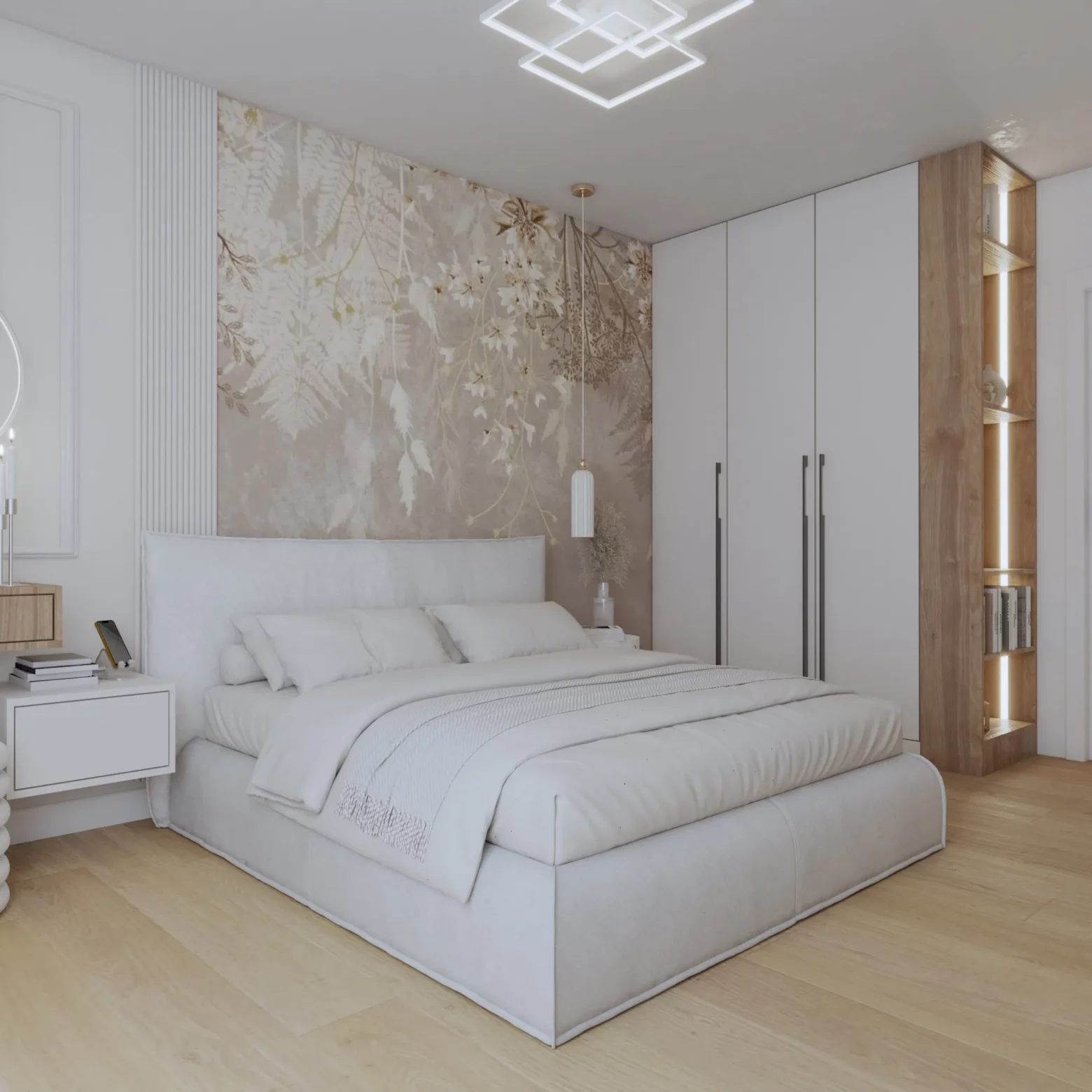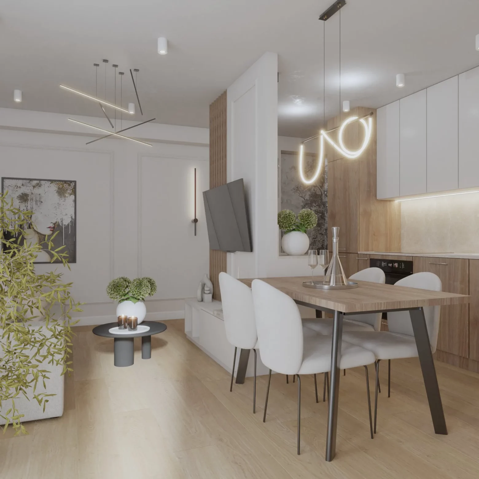 Ten nowoczesny projekt mieszkania w Gorlicach łączy jasne, przestronne wnętrza z naturalnymi materiałami i subtelnymi motywami florystycznymi. Drewno, stonowane kolory i delikatne dekoracje nadają wnętrzu świeży, przytulny charakter. Idealne rozwiązanie dla osób szukających harmonii między nowoczesnością a naturą.