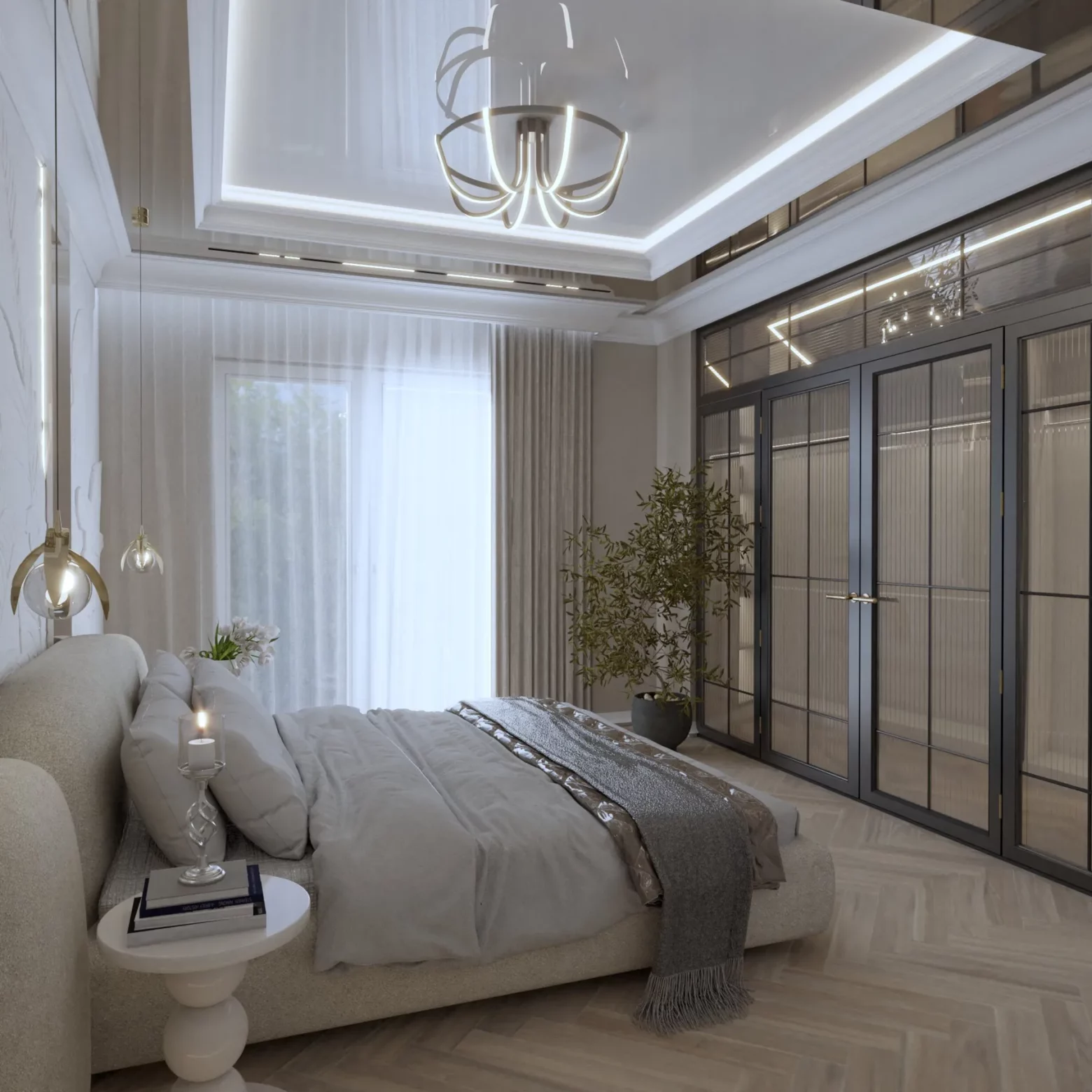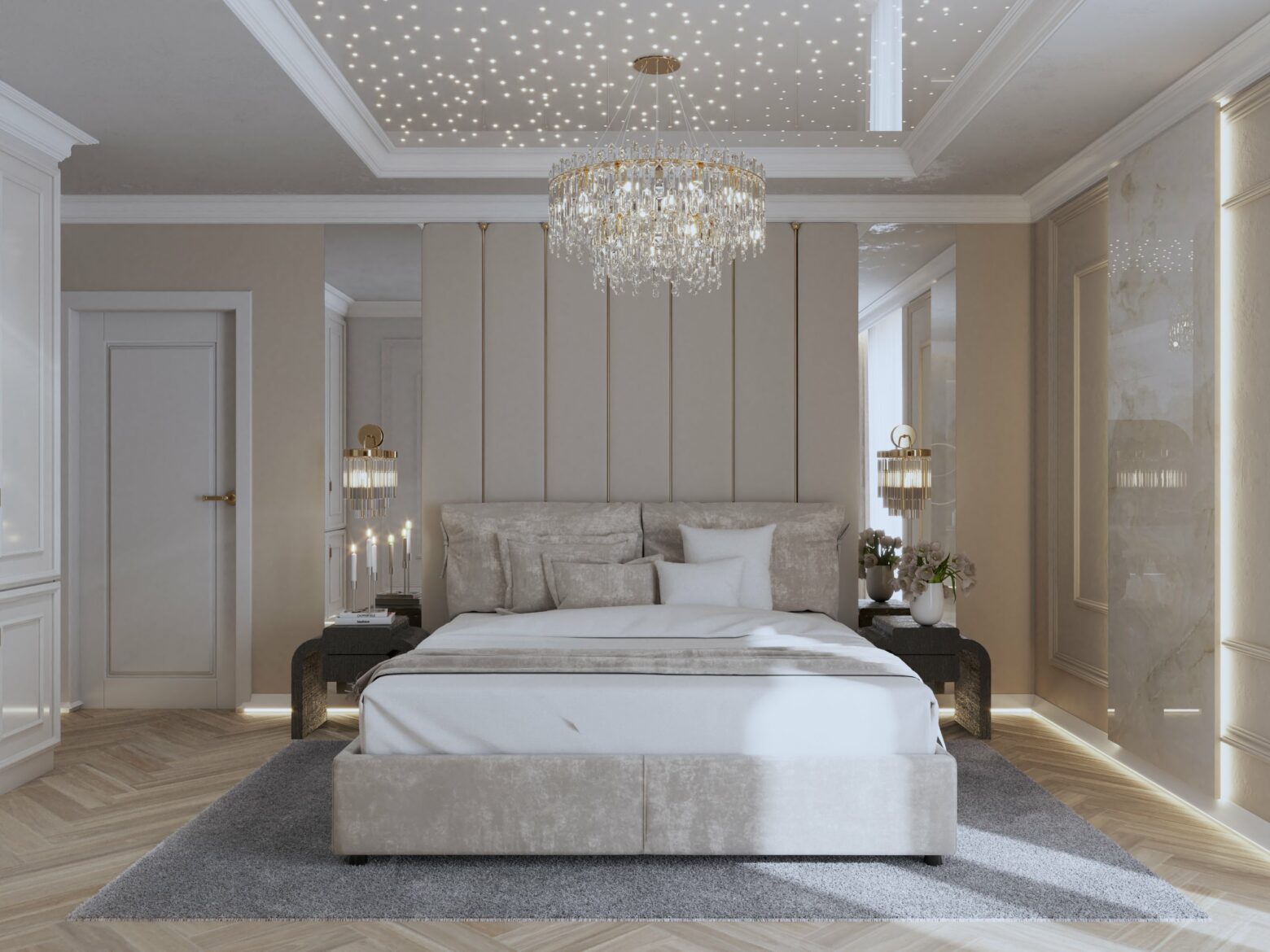 Projekt wnętrza w stylu glamour – luksusowa sypialnia i efektowna łazienka