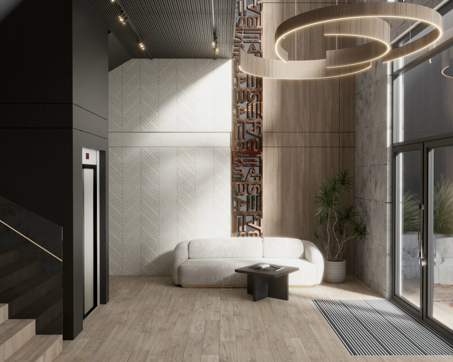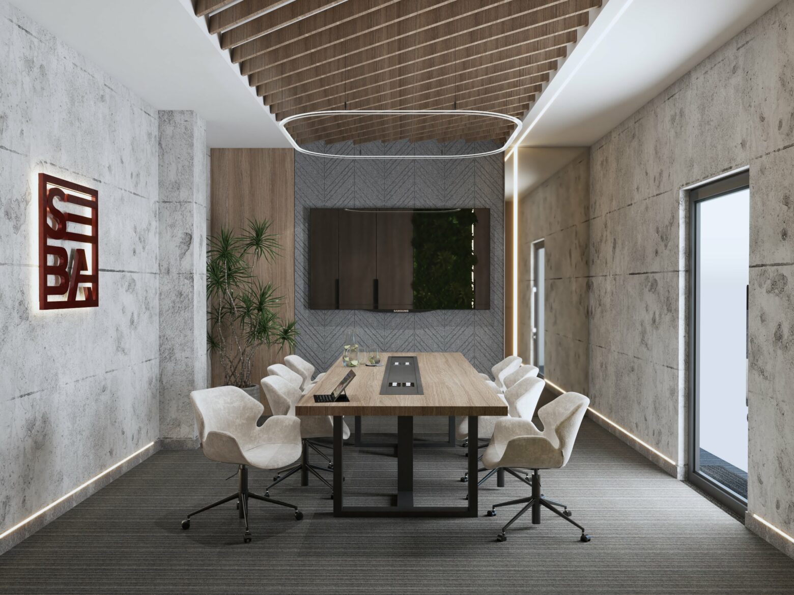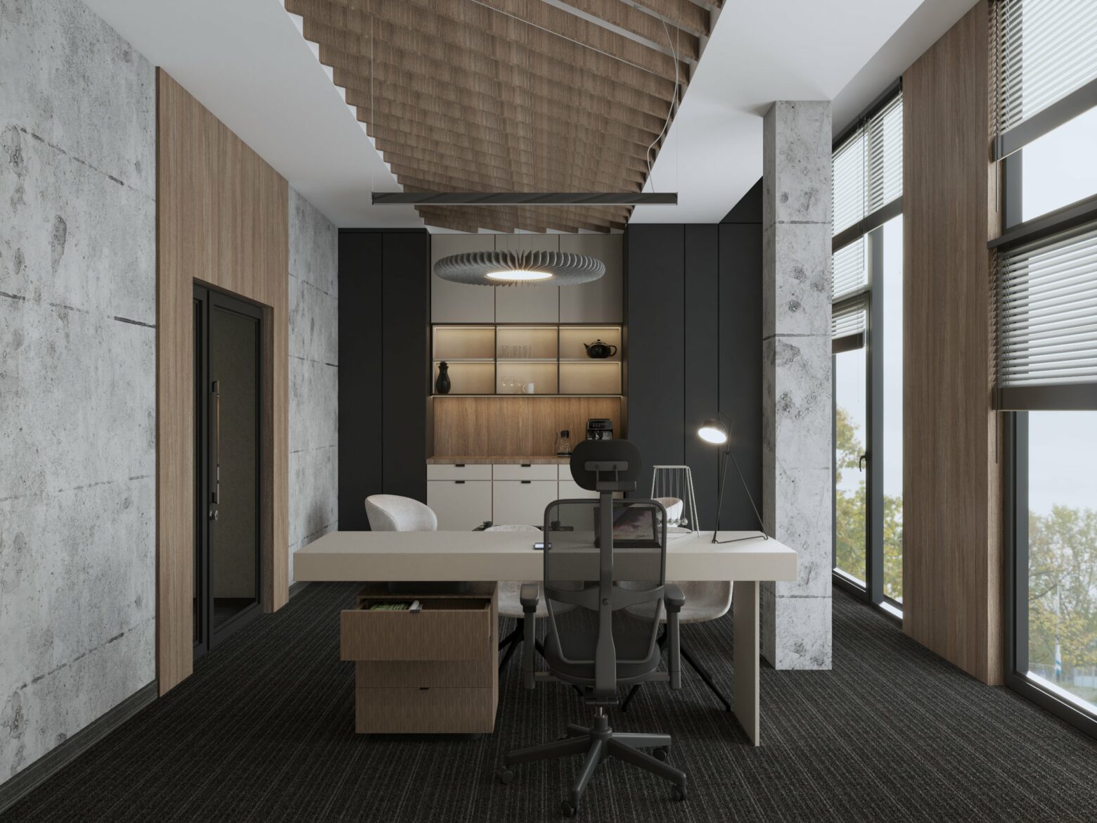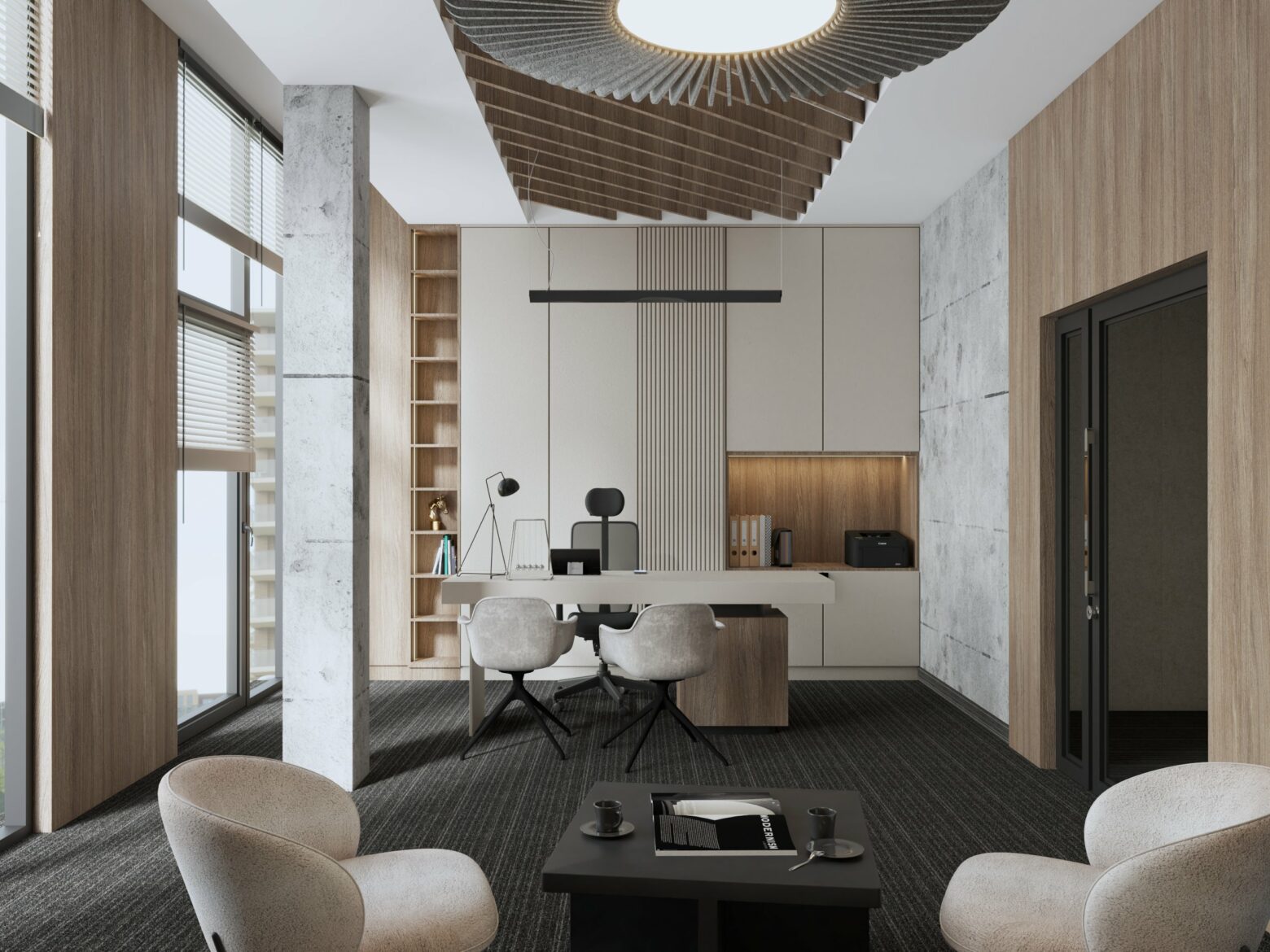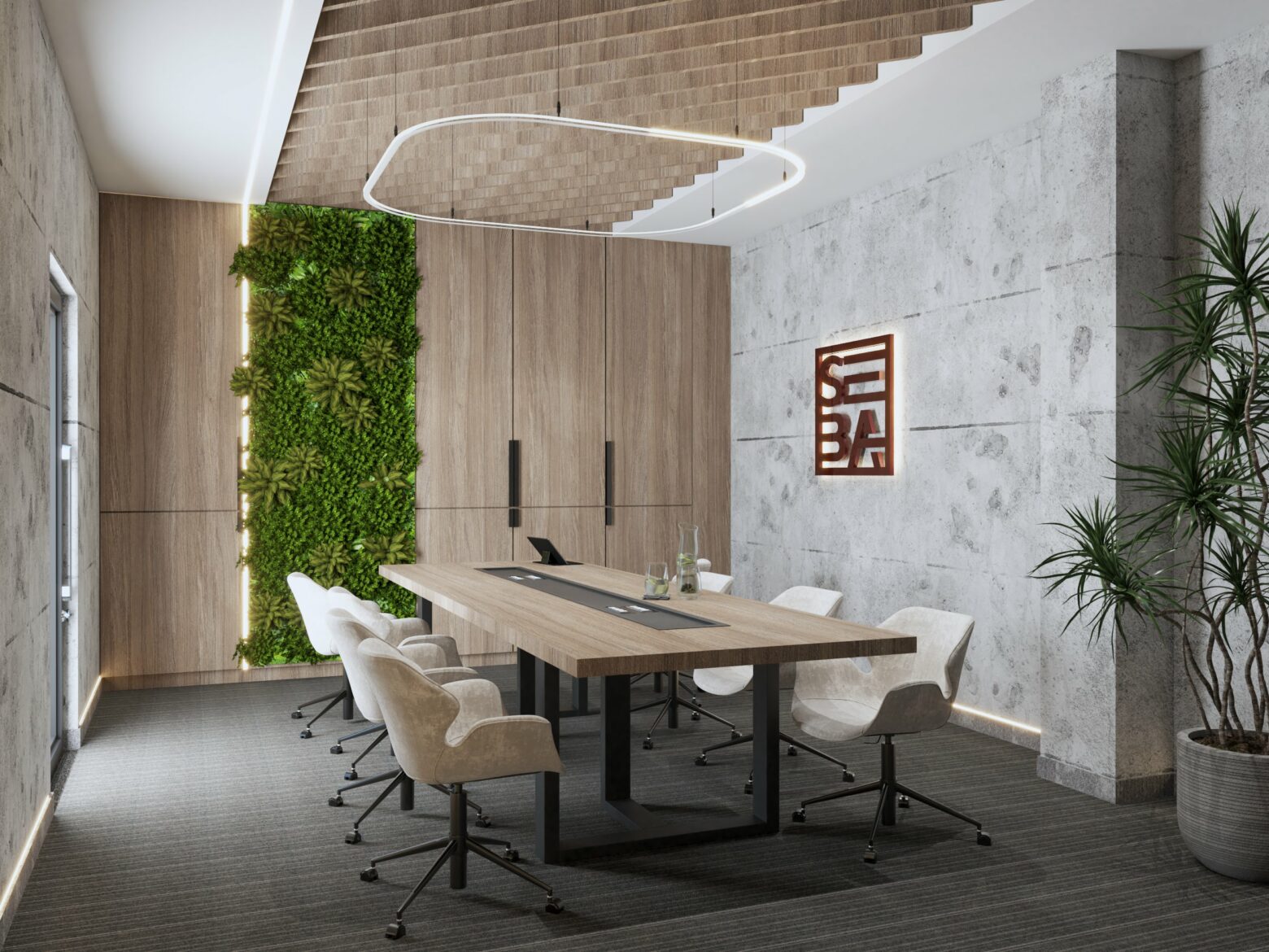 Eleganckie i nowoczesne biuro, w którym naturalne materiały, jak drewno i marmur, łączą się z subtelną grą światła, tworząc prestiżową i funkcjonalną przestrzeń. Przemyślany design sprzyja zarówno komfortowi pracy, jak i reprezentacyjnemu charakterowi wnętrza. Zielone akcenty i unikalne detale dodają całości harmonii i wyjątkowego stylu